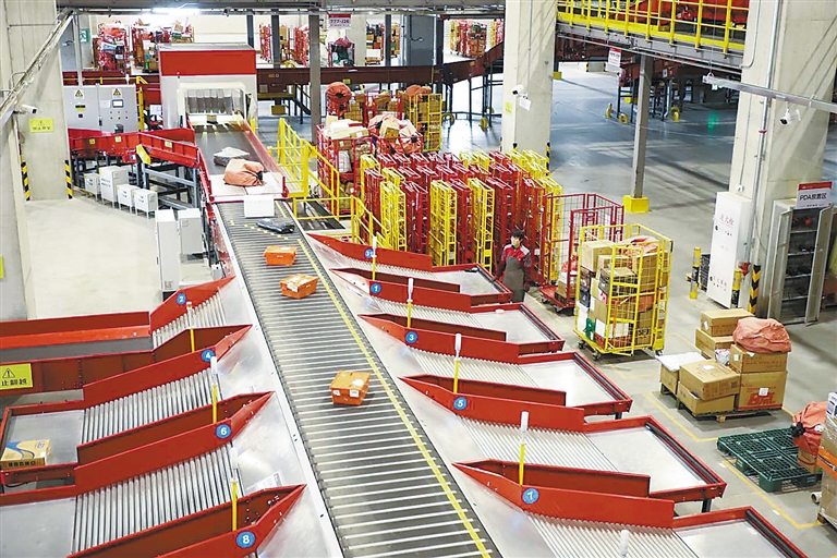 圖為在京東智能產(chǎn)業(yè)園廊坊固安二期項(xiàng)目工業(yè)智能分撥中心,分揀工作正自動(dòng)化高速進(jìn)行。記者 董旭旭 攝