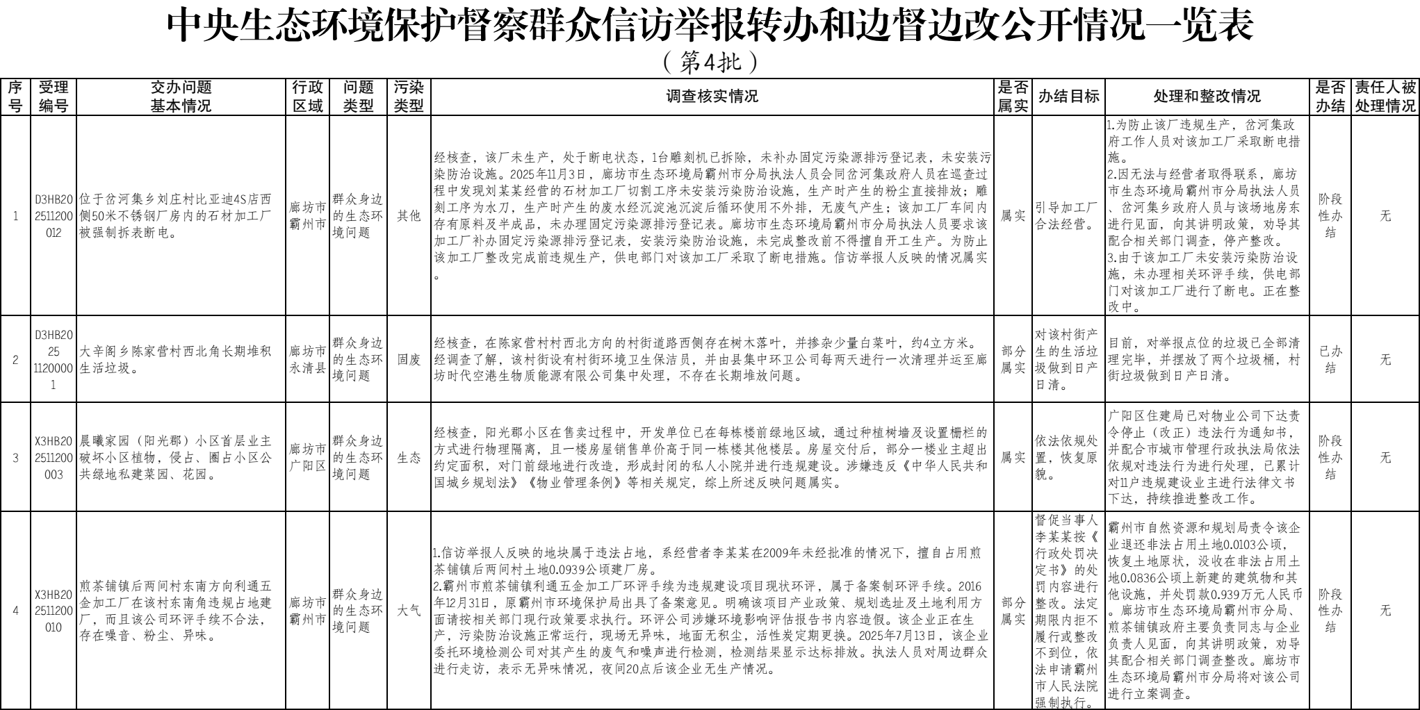 中央生態(tài)環(huán)境保護(hù)督察組交辦廊坊市第四批群眾信訪舉報(bào)案件辦理情況
