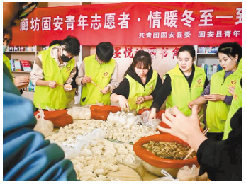 12月21日,固安團(tuán)縣委聯(lián)合縣青年志愿者協(xié)會、青年聯(lián)合會,共同舉辦“廊坊固安青年志愿者·情暖冬至——致敬城市守護(hù)者”志愿活動,為環(huán)衛(wèi)工人、外賣員等城市守護(hù)者送上熱騰騰的餃子。