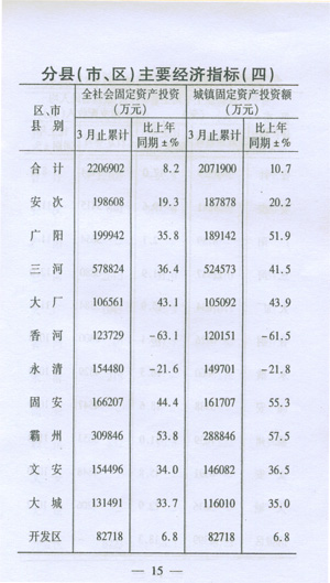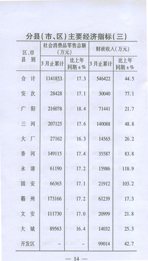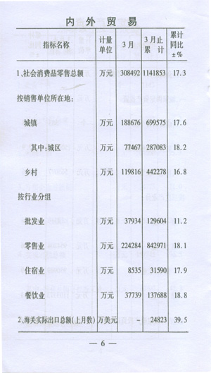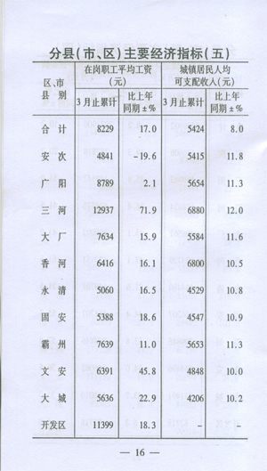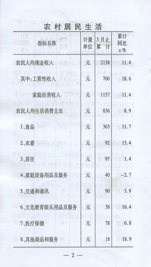 ——收入穩(wěn)步增加。一季度,城鎮(zhèn)居民人均可支配收入5424,同比增加289元,增長8.0%;在崗職工平均工資8229元,同比增加1196元,增長17.0%;初步預(yù)測農(nóng)民人均現(xiàn)金收入達(dá)到2138元,同比增加219元,增長11.4%。
