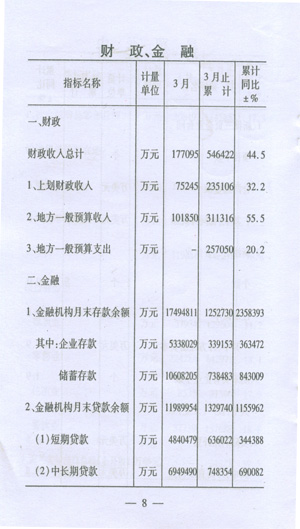 ——金融形勢平穩(wěn)。3月末,全市金融機(jī)構(gòu)本外幣各項存款余額1749.5億元,比年初增加125.3億元,其中城鄉(xiāng)居民儲蓄存款余額1060.8億元,比年初增加73.8億元,各項貸款余額1199.0億元,比年初增加133.O億元。