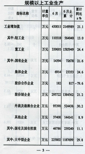 ——工業(yè)增長(zhǎng)較快。全市規(guī)模以上工業(yè)實(shí)現(xiàn)增加值215.0億元,同比增長(zhǎng)21.1%,增速比上年同期提高10.1個(gè)百分點(diǎn)。大中型企業(yè)作用突出,實(shí)現(xiàn)增加值118.8億元,增長(zhǎng)29.8%,快于規(guī)模以上工業(yè)平均增速8.7個(gè)百分點(diǎn)。
