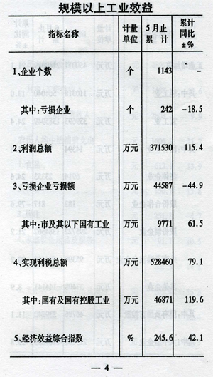 工業(yè)效益增勢(shì)強(qiáng)勁。1-5月份規(guī)模以上工業(yè)實(shí)現(xiàn)利稅52.8億元,同比增長(zhǎng)79.1%,增速比上年同期提高87.8個(gè)百分點(diǎn)。其中利潤(rùn)37.2億元,同比增長(zhǎng)115.4%,比上年同期提高134.6個(gè)百分點(diǎn)。