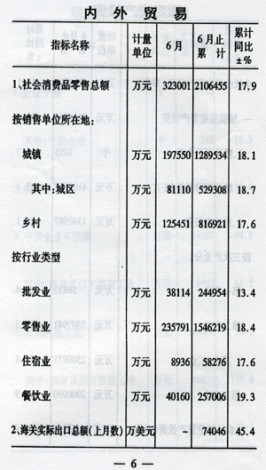 ——消費(fèi)市場(chǎng)平穩(wěn)。全市消費(fèi)市場(chǎng)繼續(xù)保持平穩(wěn)較快增長(zhǎng)發(fā)展態(tài)勢(shì),累計(jì)實(shí)現(xiàn)社會(huì)消費(fèi)品零售總額210.6億元,同比增長(zhǎng)17.9%,增速比上年同期提高0.1個(gè)百分點(diǎn)。城鄉(xiāng)市場(chǎng)同步增長(zhǎng),分別增長(zhǎng)18.1%和17.6%。