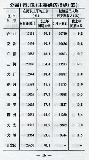 ——居民收入持續(xù)增加。據(jù)抽樣調(diào)查統(tǒng)計(jì),上半年,全市城鎮(zhèn)居民人均可支配收入10710元,同比增長(zhǎng)9.8%;城鎮(zhèn)在崗職工平均工資17111元,同比增長(zhǎng)19.1%;預(yù)計(jì)農(nóng)民人均現(xiàn)金收入4827元,同比增長(zhǎng)12.4%。