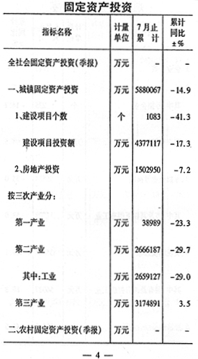 ——投資增速下降。城鎮(zhèn)固定資產(chǎn)投資完成588.0億元,同比下降14.9%,與上半年相比降幅擴大1.8個百分點。其中房地產(chǎn)投資完成150.3億元,下降7.2%。