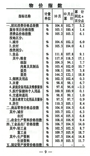 ——物價(jià)繼續(xù)上揚(yáng)。全市居民消費(fèi)價(jià)格總指數(shù)102.7,商品零售價(jià)格總指數(shù)為104.3。與上年同期相比,漲幅分別提高5.2個(gè)和6.6個(gè)百分點(diǎn)。農(nóng)業(yè)生產(chǎn)資料價(jià)格上漲6.9%,工業(yè)品出廠價(jià)格上漲4.3%。