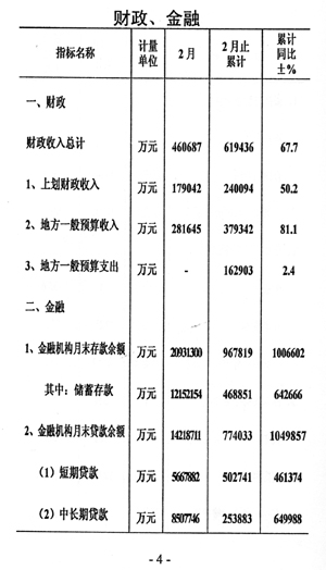 ——市場物價高開。全市居民消費價格總指數(shù)105.2,同比提高3.5個百分點,農(nóng)業(yè)生產(chǎn)資料價格上漲7.5%,工業(yè)生產(chǎn)者出廠價格上漲6.6%。商品零售價格總指數(shù)104.3,同比提高O.2個百分點?!斦鰟輳妱?。財政收入實現(xiàn)61.9億元,增長67.7%。其中地方一般預(yù)算收入完成37.9億元,增長81.1%?!鹑诖尜J穩(wěn)定。截至2月底,全市本外幣各項存款余額2093.1億元,比年初增加96.8億元,其中城鄉(xiāng)居民儲蓄存款余額1215.2億元,比年初增加46.9億元,各項貸款余額1421.9億元,比年初增加77.4億元。?