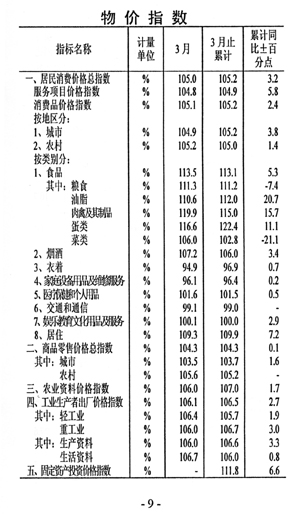 一一物價(jià)高位運(yùn)行。全市居民消費(fèi)價(jià)格總指數(shù)105.2,同比提高3.2個(gè)百分點(diǎn),農(nóng)業(yè)生產(chǎn)資料價(jià)格上漲7.0%,工業(yè)生產(chǎn)者出廠(chǎng)價(jià)格上漲6.5%。商品零售價(jià)格總指數(shù)104.3,同比提高0.1個(gè)百分點(diǎn)。