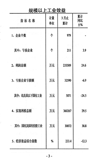 企業(yè)效益良好。一季度規(guī)模以上工業(yè)企業(yè)實(shí)現(xiàn)利稅和利潤(rùn)分別為36.0億元和23.6億元,同比分別增長(zhǎng)29.5%和24.6%,與前兩個(gè)月相比增速分別提高3.7個(gè)和O.4個(gè)百分點(diǎn)。