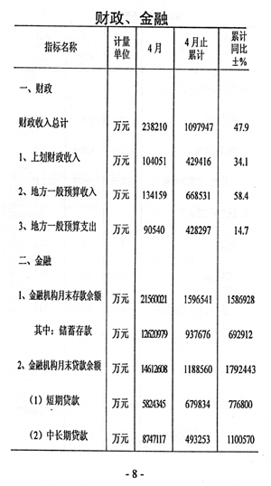 ——金融存貸穩(wěn)定。截至4月底,全市本外幣各項(xiàng)存款余額2156.0億元,比年初增加159.7億元,其中城鄉(xiāng)居民儲(chǔ)蓄存款余額1262.1億元,比年初增加93.8億元,各項(xiàng)貸款余額1461.3億元,比年初增加118.9億元。