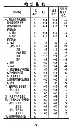 ——物價(jià)高位運(yùn)行。全市居民消費(fèi)價(jià)格總指數(shù)105.1,同比提高3.O個(gè)百分點(diǎn),與一季度相比回落0.1個(gè)百分點(diǎn)。商品零售價(jià)格上漲4.2%,同比回落0.2個(gè)百分點(diǎn)。農(nóng)業(yè)生產(chǎn)資料價(jià)格上漲6.8%,工業(yè)生產(chǎn)者出廠價(jià)格上漲5.8%。