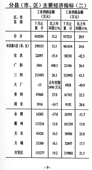 企業(yè)效益回落。前七個(gè)月規(guī)模以上工業(yè)企業(yè)實(shí)現(xiàn)利稅和利潤(rùn)分別為95.7億元和64.2億元,同比分別增長(zhǎng)20.9%和15.2%,與上半年相比增速分別回落9.3個(gè)和6.4個(gè)百分點(diǎn)。