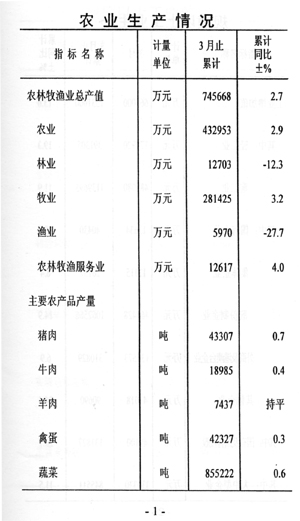 ——農(nóng)業(yè)生產(chǎn)平穩(wěn)。全市完成農(nóng)林牧漁業(yè)增加值48.4億元,增長2.7%,與上年同期相比增速回落0.4個百分點。分行業(yè)看:農(nóng)林牧漁服務(wù)業(yè)增長最快為4.O%,與上年同期相比增速提高1.7個百分點。主要農(nóng)產(chǎn)品產(chǎn)量基本保持小幅增長。
