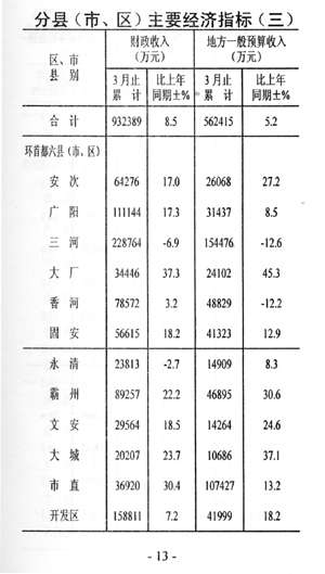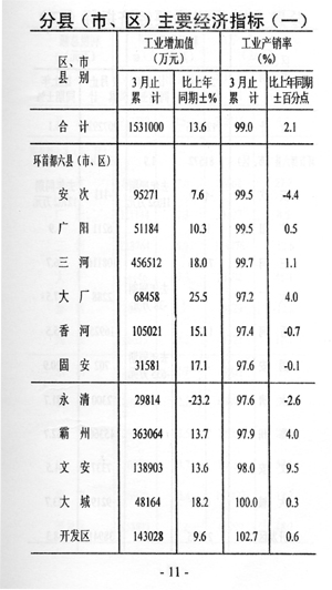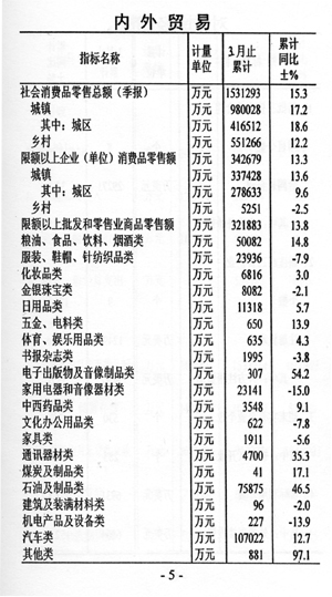 ——物價相對穩(wěn)定。一季度全市居民消費價格總指數(shù)(CPI)103.5,同比回落1.7個百分點,商品零售價格總指數(shù)104.2,同比回落0.1個百分點。農(nóng)業(yè)生產(chǎn)資料價格上漲6.2%,工業(yè)生產(chǎn)者出廠價格下降3.9%。