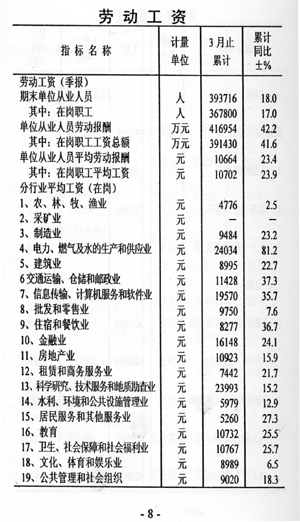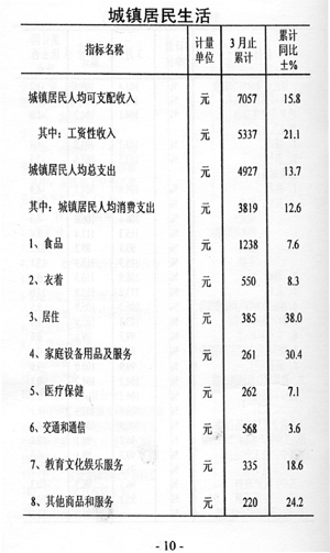 ——收入穩(wěn)步增加。一季度城鎮(zhèn)居民人均可支配收入7057元,同比增加962元,增長15.8%,與上年同期相比增速提高3.4個百分點;在崗職工平均工資10702元,增長23.9%,與上年同期相比增速提高18.9個百分點。農(nóng)民人均現(xiàn)金收入3228元,同比增加483元,增長17.6%。