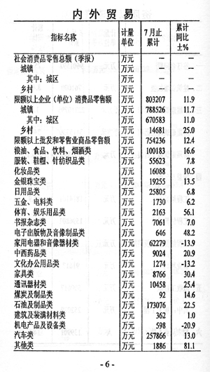 ——消費穩(wěn)定增長。限額以上社會消費品零售額完成80.3億元,增長11.9%,與上年同期相比增速回落13.1個百分點。其中城鎮(zhèn)實現(xiàn)社會消費品零售額增長11.7%,低于鄉(xiāng)村消費13.3個百分點。7月份限額以上企業(yè)實現(xiàn)社會消費品零售額增長9.o%,與上月相比降低2.0個百分點。