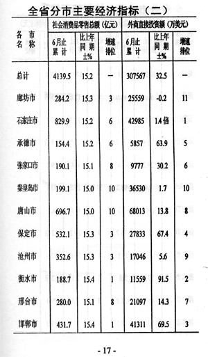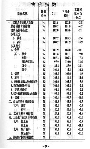 ——物價穩(wěn)中有落。居民消費價格總指數(shù)102.9,漲幅與上年同期相比回落2.8個百分點。商品零售價格指數(shù)103.3,同比回落1.7個百分點。農(nóng)業(yè)生產(chǎn)資料價格指數(shù)106.3,同比回落1.5個百分點,工業(yè)生產(chǎn)者出廠價格指數(shù)95.8,同比回落10.O個百分點。其中7月份全市居民消費價格上漲1.6%,與6月份相比回落1.1個百分點。