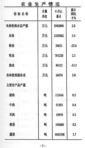 ——農業(yè)形勢穩(wěn)定。前三季度實現農林牧漁業(yè)產值298.3億元,同比增長2.8%,與上年同期相比回落O.5個百分點。分行業(yè)看農林牧漁服務業(yè)產值增長最快為5.0%。其它主要農產品產量均保持小幅增長,豬牛羊及禽蛋產量分別增長0.5%、0.4%、O.3%和O.2%。蔬菜產量增長3.7%。