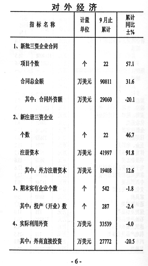 ——外資增速回落。實際利用外資完成33539萬美元,下降4.0%,與上年同期相比增速提高5.8個百分點。其中外商直接投資完成27772萬美元,下降20.5%。