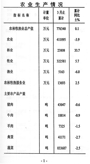 ——農業(yè)生產(chǎn)平緩。全市完成農林牧漁業(yè)總產(chǎn)值77.6億元,增長0.1%,與上年同期相比增速回落2.6個百分點。分行業(yè)看,林業(yè)增長最快為33.7%。