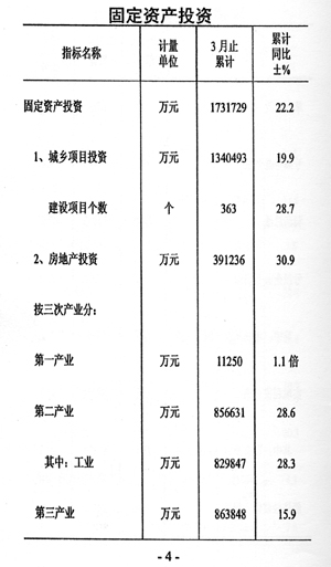 ——投資增長較快。全市完成固定資產(chǎn)投資173.2億元,增長22.2%,與前兩個月相比增速回落0.1個百分點,與上年同期相比增速回落5.8個百分點。其中第一產(chǎn)業(yè)增速最快為1.1倍,房地產(chǎn)投資增長30.9%。