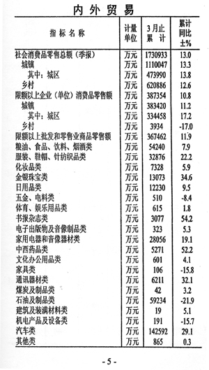 ——消費穩(wěn)定拉動。全市社會消費品零售總額實現(xiàn)173.l億元,增長13.0%,與上年同期相比增速回落2.3個百分點。其中限額以上社會消費品零售總額實現(xiàn)38.7億元,增長10.8%。