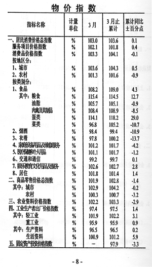 ——物價指數(shù)上漲。全市居民消費價格總指數(shù)103.6,同比提高0.1個百分點,商品零售價格指數(shù)102.8,同比回落1.4個百分點。農業(yè)生產(chǎn)資料價格上漲3.3%,工業(yè)生產(chǎn)者出廠價格指數(shù)下降2.5%。