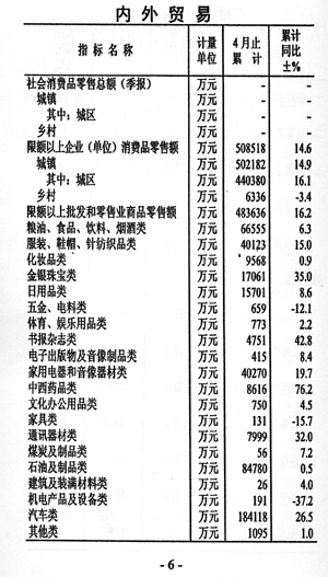 ——消費品市場穩(wěn)步增長。限額以上單位實現(xiàn)社會消費品零售總額50.9億元,增長14.6%,與上年同期相比增速提高2.7個百分點。其中城鎮(zhèn)實現(xiàn)消費品零售總額50.2億元,增長14.9%,高于鄉(xiāng)村消費18.3個百分點。