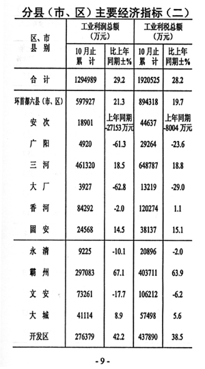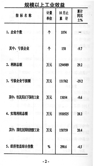 工業(yè)效益持續(xù)增長(zhǎng)。1-10月份,規(guī)模以上工業(yè)實(shí)現(xiàn)利潤(rùn)總額129.5億元,增長(zhǎng)29.2%,與1-9月相比增速提高0.2個(gè)百分點(diǎn)。實(shí)現(xiàn)利稅總額192.1億元,增長(zhǎng)28.2%,與1-9月相比增速提高1.8個(gè)百分點(diǎn)。