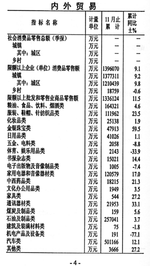 ——消費(fèi)增速回落。限額以上單位實(shí)現(xiàn)社會(huì)消費(fèi)品零售額139.6億元,增長(zhǎng)9.1%,與1-10月份相比增速回落1.5個(gè)百分點(diǎn)。其中城鎮(zhèn)實(shí)現(xiàn)社會(huì)消費(fèi)品零售額137.7億元,增長(zhǎng)9.2%;鄉(xiāng)村實(shí)現(xiàn)零售額1.9億元,下降0.6%。