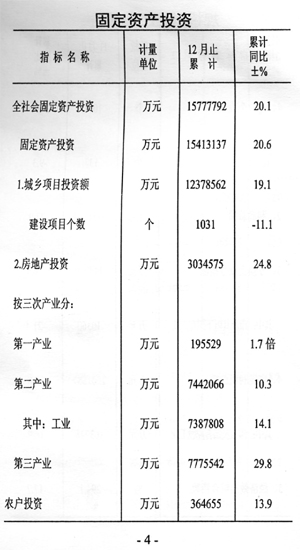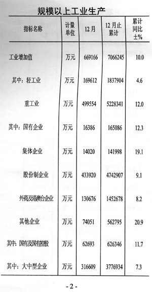 ——工業(yè)生產(chǎn)穩(wěn)定。規(guī)模以上工業(yè)增加值完成706.6億元,增長10.0%。增速與前三季度相比加快O.2個百分點,與上年相比回落4.1個百分點。分輕重工業(yè)看,輕工業(yè)實現(xiàn)增加值183.8億元,增長4.6%;重工業(yè)實現(xiàn)增加值522.8億元,增長12.O%。