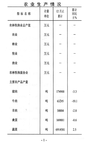 ——農業(yè)生產(chǎn)平穩(wěn)。蔬菜產(chǎn)量691.5萬噸,增長2.5%。豬、牛、羊肉產(chǎn)量分別為17.5萬噸、6.3萬噸和3.1萬噸,分別下降3.3%、19.1%和2.8%,禽蛋產(chǎn)量17.0萬噸,下降8.6%。
