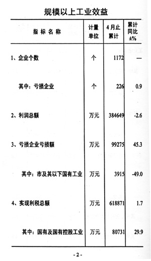 1-4月份,實(shí)現(xiàn)利潤(rùn)總額38.5億元,下降2.6%,比上年同期回落26.0個(gè)百分點(diǎn);實(shí)現(xiàn)利稅總額61.9億元,增長(zhǎng)1.7%,與上年同期相比回落58.1個(gè)百分點(diǎn)。