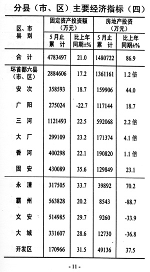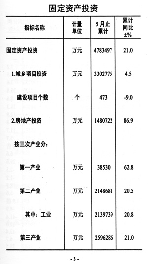 ——投資增長(zhǎng)較快。全市固定資產(chǎn)投資完成478.3億元,增長(zhǎng)21.0%,與1-4月份相比提高3.9個(gè)百分點(diǎn),比上年同期回落2.6個(gè)百分點(diǎn)。其中,房地產(chǎn)開(kāi)發(fā)投資完成148.1億元,增長(zhǎng)86.9%。分產(chǎn)業(yè)看,第一產(chǎn)業(yè)3.9億元,增長(zhǎng)62.8%;第二產(chǎn)業(yè)214.9億元,增長(zhǎng)20.5%;第三產(chǎn)業(yè)259.6億元,增長(zhǎng)21.0%。