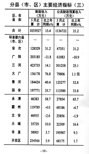 ——財(cái)政快速增長(zhǎng)。全市財(cái)政收入實(shí)現(xiàn)183.6億元,增長(zhǎng)15.4%,其中,公共財(cái)政預(yù)算收入實(shí)現(xiàn)113.7億元,增長(zhǎng)21.2%,與1-4月份相比均回落1.0個(gè)百分點(diǎn),與上年同期相比提高5.0和9.7個(gè)百分點(diǎn)。