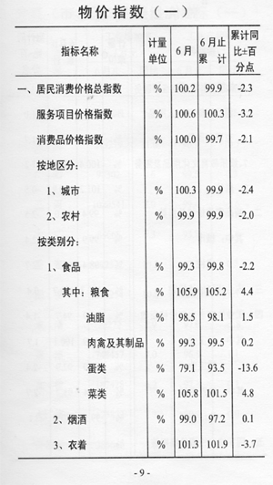 ——物價低位運行。全市居民消費價格總指數(shù)99.9,同比回落2.3個百分點;商品零售價格總指數(shù)99.0,同比回落2.5個百分點;農(nóng)業(yè)生產(chǎn)資料價格指數(shù)100.7,同比提高0.4個百分點;工業(yè)生產(chǎn)者出廠價格指數(shù)94.7,同比回落1.4個百分點。