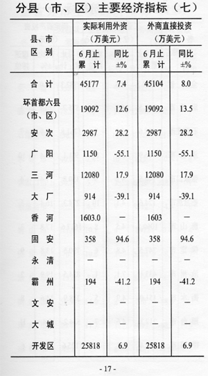 ——外資增速加快。全市實際利用外資完成45177萬美元,同比增長7.4%,比1-5月份提高70.3個百分點。其中,外商直接投資完成45104萬美元,增長8.0%。