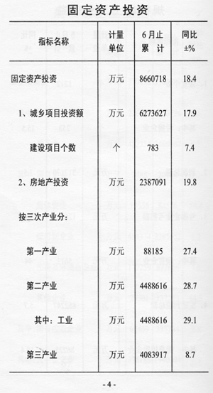 ——投資較快增長。全市固定資產(chǎn)投資完成866.1億元,同比增長18.4%,比1-5月份回落2.0個百分點。其中,城鄉(xiāng)項目投資627.4億元,增長17.9%;房地產(chǎn)開發(fā)投資238.7億元,增長19.8%。
