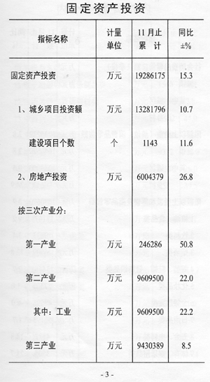 ——投資增速放緩。固定資產(chǎn)投資完成1928.6億元,同比增長15.3%,增速比1-10月份回落0.7個百分點,比上年同期回落4.4個百分點。分產(chǎn)業(yè)看,第一產(chǎn)業(yè)投資24.6億元,增長50.8%;第二產(chǎn)業(yè)投資961.0億元,增長22.0%;第三產(chǎn)業(yè)投資943.0億元,增長8.5%。