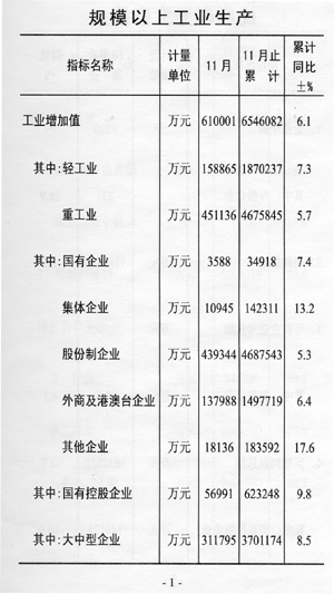 ——工業(yè)小幅回升。全市規(guī)模以上工業(yè)增加值完成654.6億元,同比增長6.1%,增速比1-10月份提高0.2個百分點,比上年同期回落1.6個百分點。分行業(yè)看,全市33個行業(yè)大類中,26個行業(yè)增加值同比增長,占78.8%。