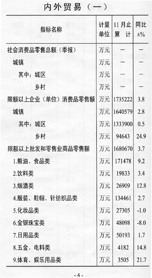 ——消費緩慢回升。全市限額以上企業(yè)消費品零售額完成173.5億元,同比增長3.8%,增速比1-10月份提高0.5個百分點,比上年同期回落7.0個百分點。其中,城鎮(zhèn)實現(xiàn)消費品零售額164.1億元,增長2.8%,鄉(xiāng)村實現(xiàn)消費品零售額9.5億元,增長24.9%。