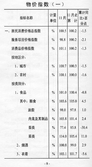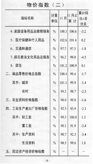 ——物價總體平穩(wěn)。全市居民消費價格總指數(shù)100.2,同比回落1.5個百分點;商品零售價格總指數(shù)99.4,回落1.7個百分點;農(nóng)業(yè)生產(chǎn)資料價格指數(shù)99.8,回落1.6個百分點;工業(yè)生產(chǎn)者出廠價格指數(shù)93.9,回落2.3個百分點。
