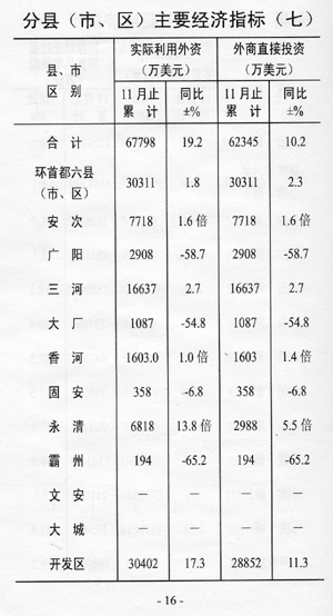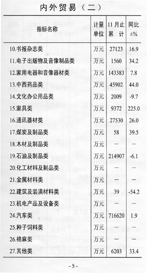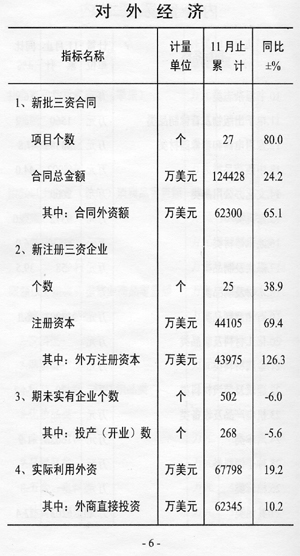 ——利用外資增加。實際利用外資67798萬美元,完成全年任務(wù)的90.4%,11月份當月到位外資14254萬美元。其中,外商直接投資62345萬美元。