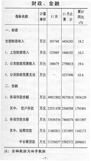 ——財政快速增長。全部財政收入完成445.6億元,同比增長18.2%,增速比1-10月份提高1.5個百分點,比上年同期提高2.0個百分點。其中:公共財政預(yù)算收入279.0億元,增長19.4%,增速比1-10月份提高1.8個百分點,比上年同期回落0.9個百分點。