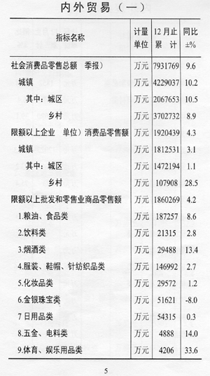 ——消費穩(wěn)中有升。社會消費品零售總額完成793.2億元,同比增長9.6%,高于全省0.2個百分點。其中,城鎮(zhèn)消費品零售額422.9億元,增長lO.2%;鄉(xiāng)村消費品零售額370.3億元,增長8.9%。分季度看,一、二、三季度均增長9.0%,全年增長9.6%。