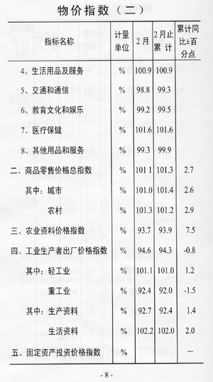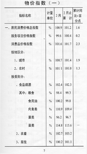 ——消費(fèi)價(jià)格漲幅回升。全市居民消費(fèi)價(jià)格總指數(shù)(CPI)101.2,漲幅同比回升1.6個(gè)百分點(diǎn)。商品零售價(jià)格總指數(shù)101.3,漲幅同比回升2.7個(gè)百分點(diǎn)。農(nóng)業(yè)生產(chǎn)資料價(jià)格下降6.1%,工業(yè)生產(chǎn)者出廠(chǎng)價(jià)格下降5.7%。