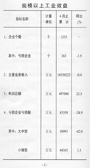 1-4月份,規(guī)模以上工業(yè)完成利潤(rùn)總額49.7億元,同比增長(zhǎng)23.5%,增幅同比提高20.0個(gè)百分點(diǎn)。