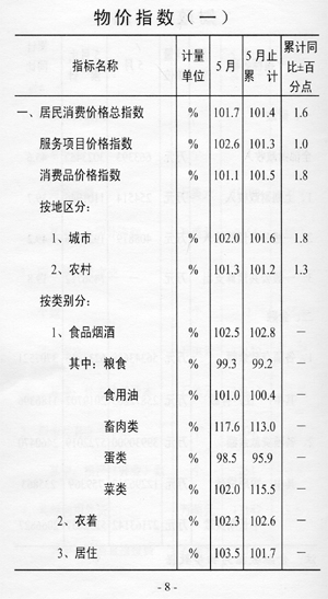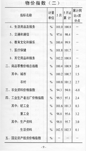 一一物價(jià)總體平穩(wěn)。全市居民消費(fèi)價(jià)格總指數(shù)101.4,同比提高1.6個(gè)百分點(diǎn);商品零售價(jià)格總指數(shù)100.9,同比提高2.0個(gè)百分點(diǎn);農(nóng)業(yè)生產(chǎn)資料價(jià)格指數(shù)94.0,同比回落6.8個(gè)百分點(diǎn);工業(yè)生產(chǎn)者出廠價(jià)格指數(shù)97.1,同比提高2.4個(gè)百分點(diǎn)。