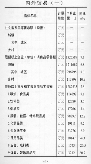 ——投資較快增長。全市固定資產(chǎn)投資完成1258.9億元,同比增長11.7%。其中,城鄉(xiāng)項(xiàng)目投資864.9億元,同比增長4.9%;房地產(chǎn)開發(fā)投資394.0億元,同比增長30.4%。分產(chǎn)業(yè)看,第一產(chǎn)業(yè)和第三產(chǎn)業(yè)投資增長較快,第一產(chǎn)業(yè)完成投資20.O億元,同比增長94.O%;第三產(chǎn)業(yè)完成投資615.2億元,同比增長17.8%。一消費(fèi)穩(wěn)步提高。全市限額以上企業(yè)消費(fèi)品零售額完成132.6億元,同比增長7.1%,為今年以來最高增速,增速同比提高1.5個百分點(diǎn)。分地區(qū)看,鄉(xiāng)村市場發(fā)展趕超城鎮(zhèn)市場,城鎮(zhèn)消費(fèi)品零售額121.2億元,同比增長6.8%;鄉(xiāng)村消費(fèi)品零售額11.4億元,同比增長lO.9%,鄉(xiāng)村高于城鎮(zhèn)4.1個百分點(diǎn)。